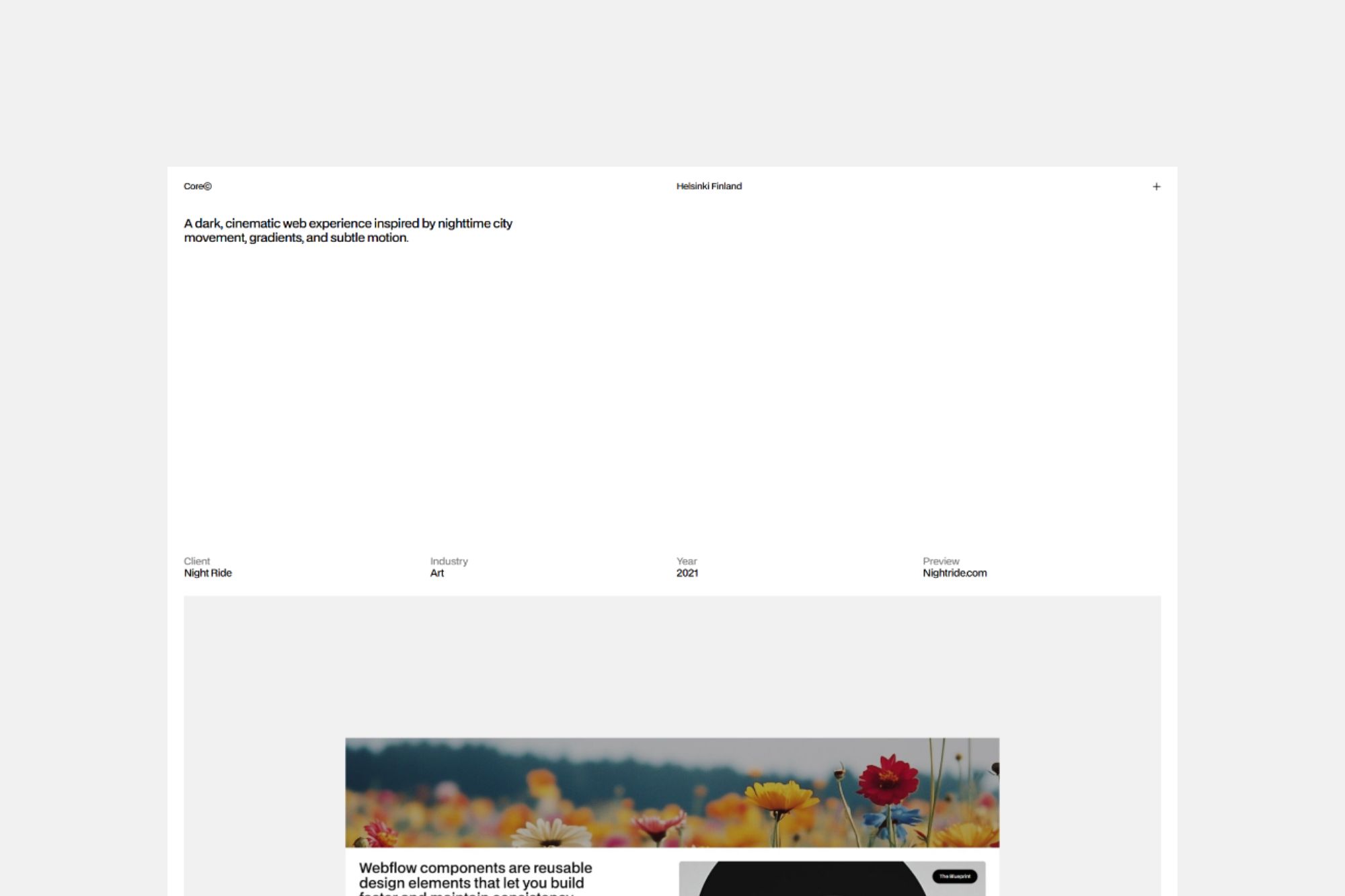 Core is a design portfolio template for minimalists. It features a custom CMS project slider (powered by Swiper.js), page transitions (by Barba.js) and clean layouts.
